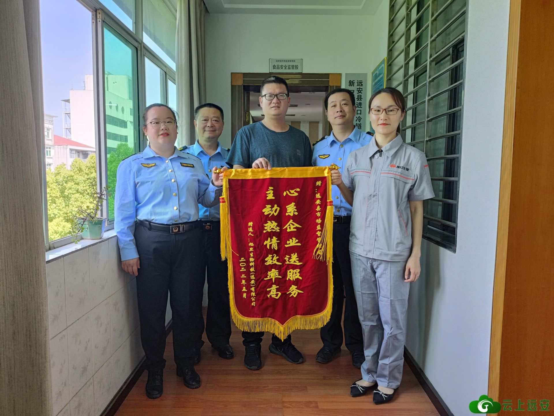 5月24日,旭旦生物科技(远安)有限公司代表将一面“心系企业送服务,主动热情效率高”的锦旗送到远安县市场监督管理局,“从协助指导我们筹建厂房到高效申办食品生产许可证,再到指导我们尽快投产获利,每一个关键环节都有你们市场监管工作人员的悉心指导帮助,真是太感谢啦!”受公司负责人覃龙平之托前来的生产厂长谭琨激动得说道。