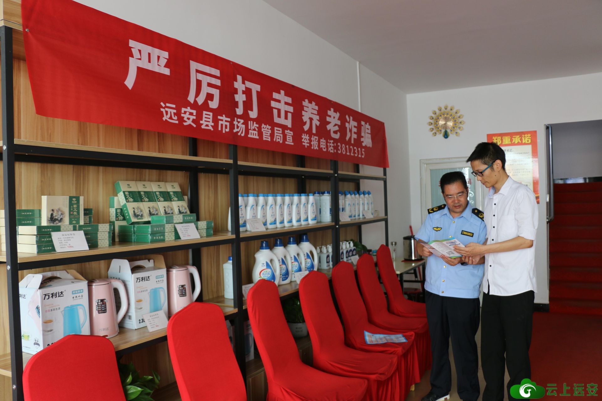 7月12日,县市场监管局执法人员在店内向经营者进行法制宣讲。笔者发现,在该门店大堂上方悬挂着“严厉打击养老诈骗”字样的宣传条幅,条幅中还公布了远安县市场监管局举报电话。