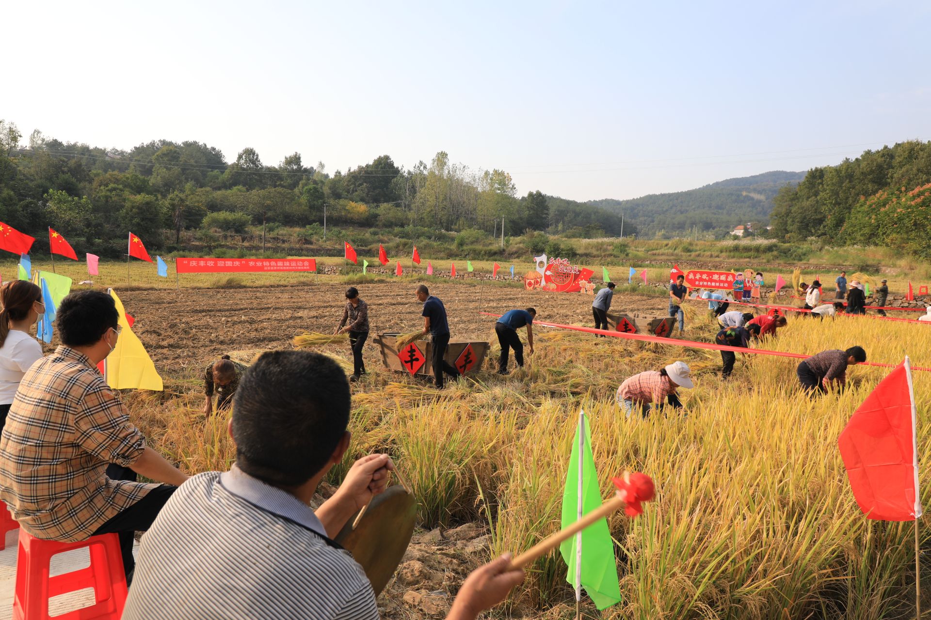 活动现场,红旗飘扬,稻谷飘香,一派喜悦景象。农民朋友们分为四组,开展稻谷收割大比拼。随着裁判的一声号令,大家分工配合,迅速挥动镰刀,割下一捆捆稻谷,用力在板仓边缘进行拍打脱粒,随后立即将脱完粒的稻草捆扎成堆。参赛选手你追我赶,围观群众加油鼓劲,现场一片欢声笑语,气氛活跃热烈。
