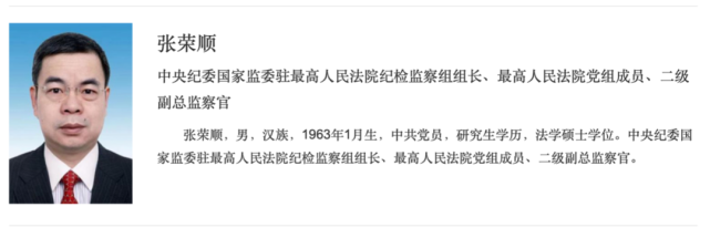北京青年报消息,最高人民法院官网院领导一栏更新显示,张荣顺已经出任中央纪委国家监委驻最高人民法院纪检监察组组长、最高人民法院党组成员、二级副总监察官。他此前担任中央人民政府驻澳门特别行政区联络办公室副主任。