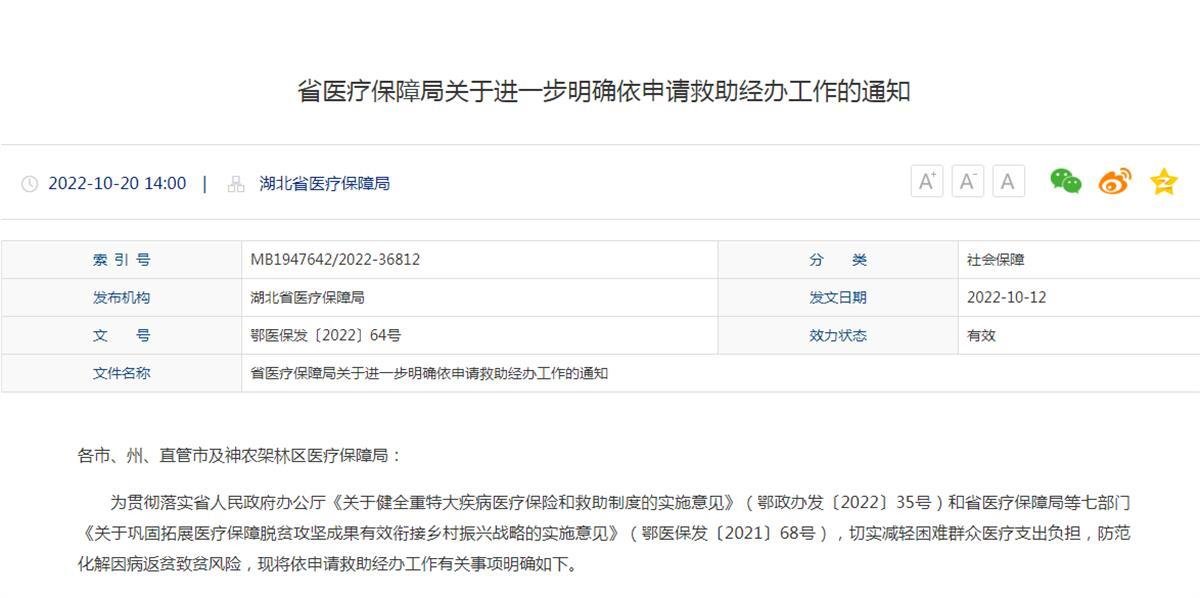 10月31日,极目新闻记者从湖北省医疗保障局官网获悉,为切实减轻困难群众和大病患者医疗费用负担,方便群众办理医疗救助申请,该局印发《关于进一步明确依申请救助经办工作的通知》,规范依申请救助申办流程,明确医疗救助对象身份认定前发生的高额医疗费用获得救助的申办流程。