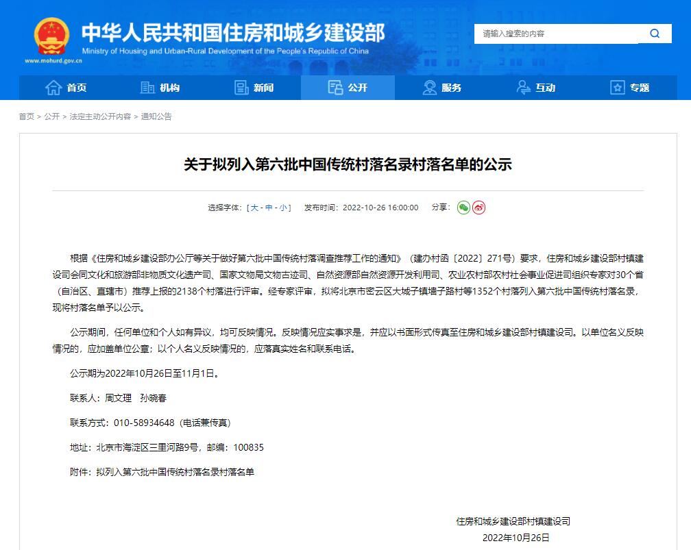近日,住房和城乡建设部公布了第六批中国传统村落名录村落名单,全国共有1352个村落拟入选。其中,河口乡落星村、漳沐村入选。