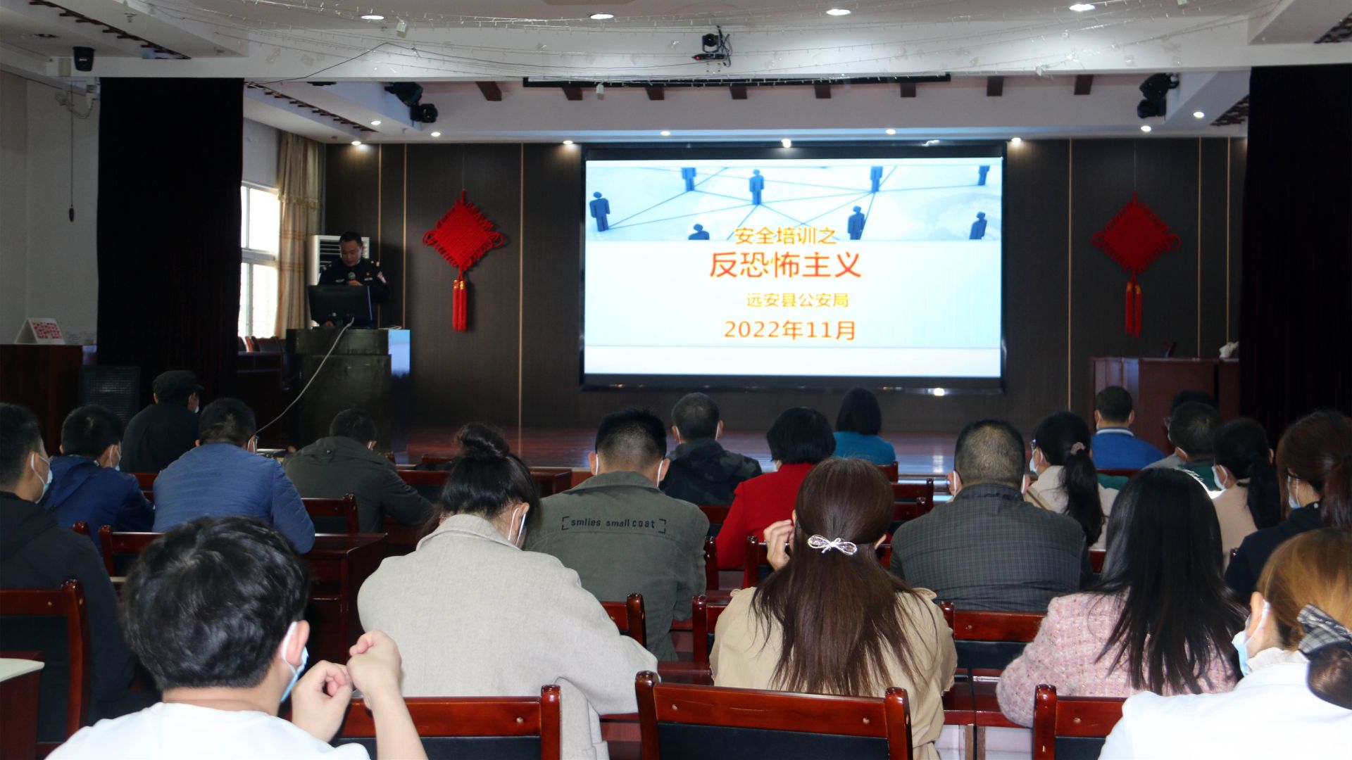 为加强平安医院建设,切实提高医务人员对恐怖事件的反应速度和应急处置能力,保障就医患者和医务人员的生命财产安全,11月24日下午,远安县中医医院邀请县公安局治安大队、特警大队5名警官来院开展反恐知识培训与演练活动。全院中层干部、各科安全员、保安共计40余人参加。