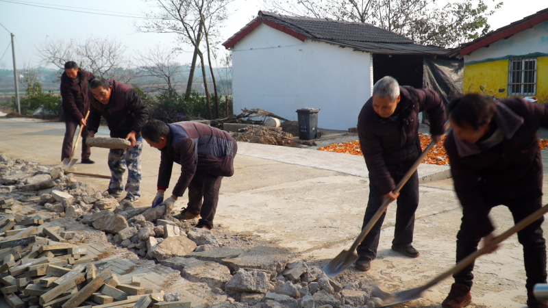 近日, 记者来到半月镇罗店村罗家店子,看到挖掘机正在整理堰塘,村中水泥路正在拓宽,广场上正在铺设地砖,有的村民帮助清理路边的碎石。这时围坐在罗雪峰家门口二十多个村民的争论声吸引了记者。