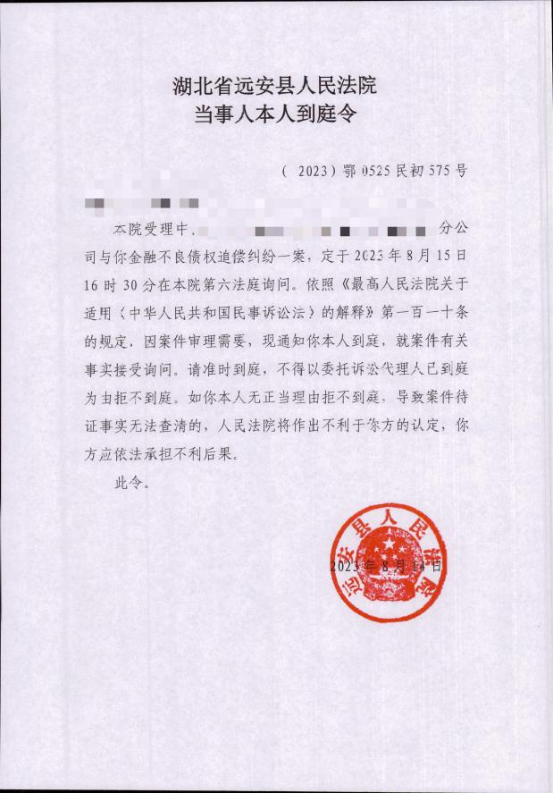 [远安] 请准时到庭!远安法院发出首份《当事人本人到庭令》
