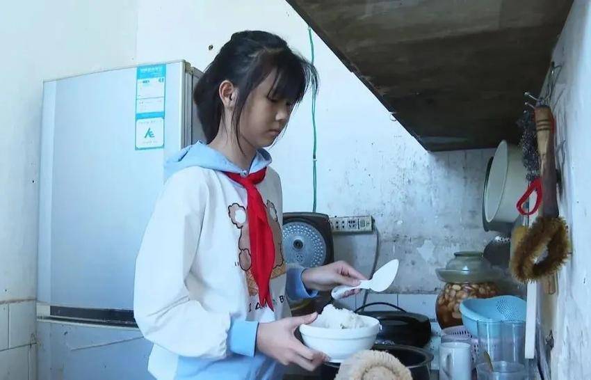 中午12点,去医院透析的爸爸还没回家,小婧萱走进厨房,淘米、加适量水、按下开关,用电饭煲煮上了米饭……麻利的动作让人感到心疼。