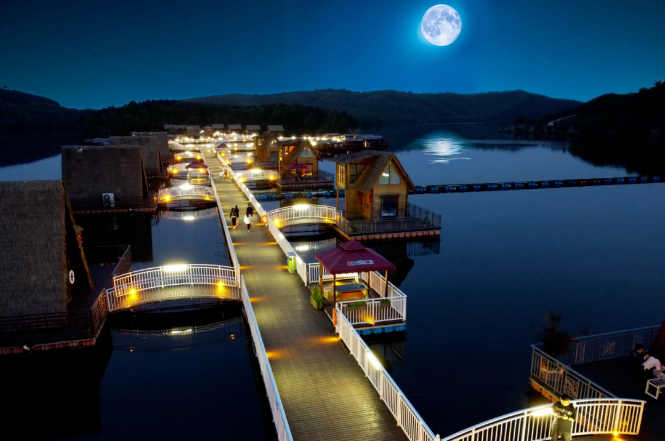关键词2:水上木屋 3000 亩水域上,画舫改建成的水上船屋、建于浮筒上的木质别墅让人眼前一新,可垂钓、可观水。
