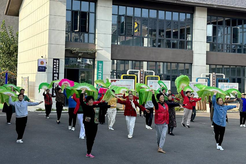 湖北日报客户端讯(通讯员 李开明 刘量 王春艳)10月23日,在远安县鸣凤镇鸣凤社区的文化广场,杨阿姨和20多名社区舞蹈队的队员饶有兴致地跳着广场舞,以此庆祝重阳节。 社区舞蹈队排练扇子舞