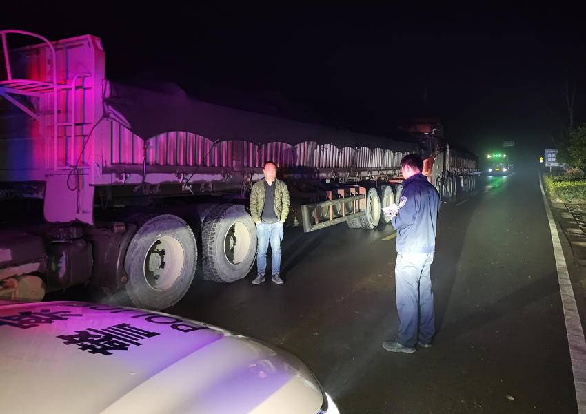 “检查一组请注意,有两辆红色超载重型货运车辆开往茅坪场集镇。”11月16日晚上6时30分,联合治理二组在G347国道原万山厂路段发现超载车辆,迅速将情况通报给在何家湾路段开展交通安全巡查的茅坪场派出所民警。10多分钟后,茅坪场派出所熊健等民警先后拦停当阳市和荆门市两辆超载的货运车辆,就在民警分别找货运车辆驾驶员调查了解情况的时候,民警又拦下了5辆同样超载的重型货运车辆。