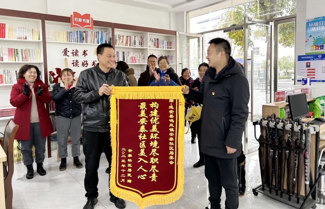 湖北日报客户端讯(通讯员 王倩)近日,鸣凤镇安泰社区居民将一面写着“构建优美环境尽职尽责 最美安泰社区美入人心”的锦旗送到社区党委书记郭勇手中,以此表达他们对居委会长期以来尽职尽责、心系群众,积极解决居民各类诉求的感激和认同。