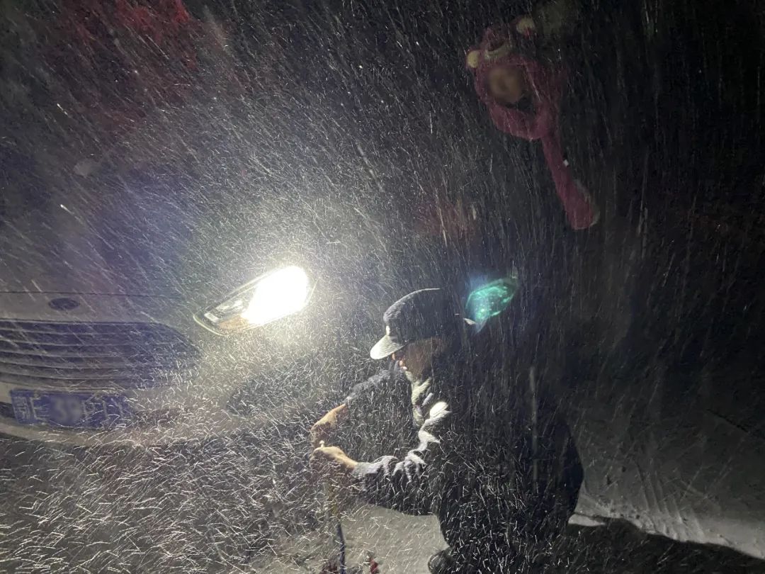 此时气温降到零摄氏度以下,李先生一家已经在车上等待了3个多小时,越来越大的雨雪让李先生不得不做最坏的打算——要么在车中蜷曲着过上一夜,要么和家人在风雪中徒步下山,不管哪种打算,都会受冻很久。就在此时,一道闪烁的红蓝警灯点亮灰白的天空,一名警察敲响了他的车窗,“需要帮助吗?可以跟着我们一起下山。”原来,玉泉派出所民警在处理道路交通事故的时候,发现路边有很多车辆面临李先生一样的状况,但派出所没有足够的防滑链保障所有车辆的安全离开,于是在处理完交通事故的同时,民警立即将情况上报,一边帮助自带防滑链的旅客加装、组织车辆有序避险,一边协调联络多方力量,在市交通局、枣林村村委会等部门共同努力下,协调人员携带救援装备与车辆进行救援。