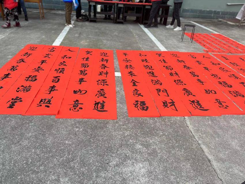 “金龙逐梦启新程 玉兔归宫酬旧岁”“金龙开序原驰蜡象岁时新 玉兔收宫鹊舞花枝天地秀”“人和家顺百事兴 富贵平安福满堂”等充满祝福的手写春联整齐亮相,浓浓的年味扑面而来……大家选对联、评对联,还相互讨论着每副春联的蕴意,忙得不亦乐乎。“今年是龙年,我刚好属龙,本来准备买一副带有龙字的春联,刚好听说今天有免费写春联的活动,我就来了,选到了心仪的春联我很高兴……”王大爷乐呵呵地向旁边的志愿者说道。