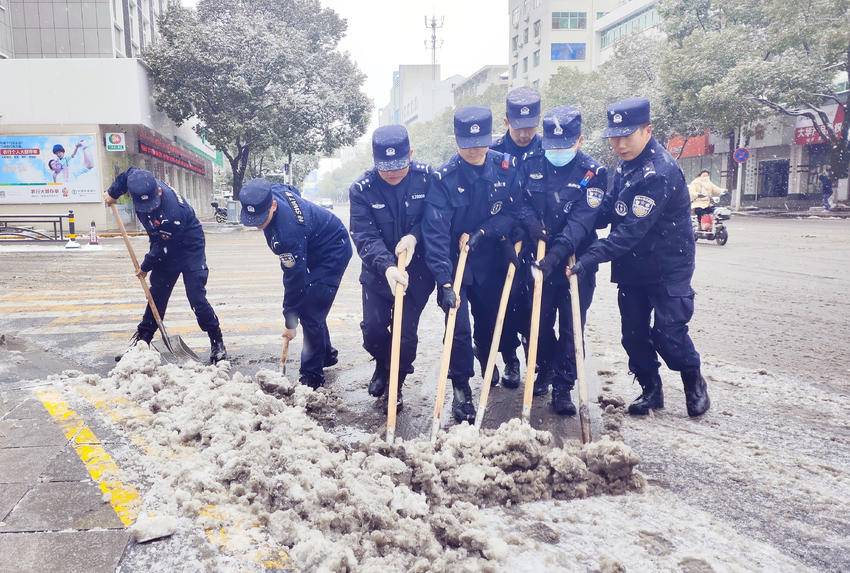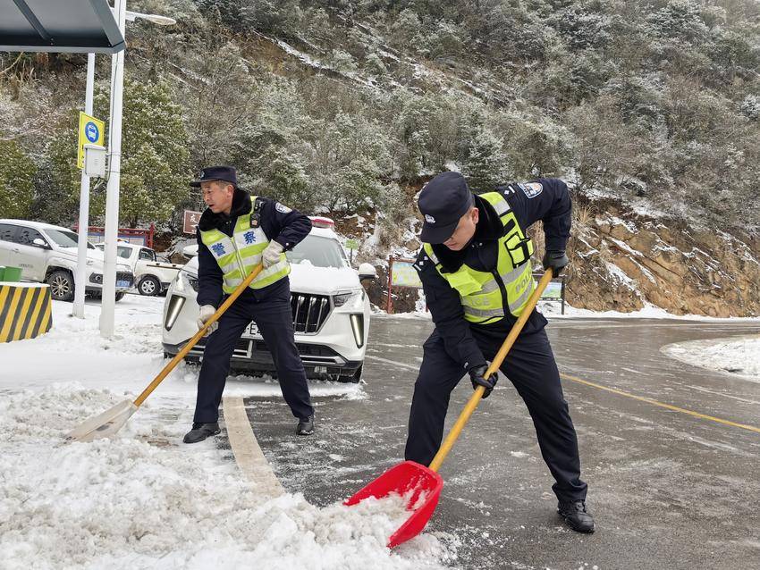 远安县公安局机关民警以雪为令,下沉到7个派出所,铲冰除雪,对积雪结冰较为严重的乡村公路,进行雪中值守和劝导,实行临时交通管制,确保群众出行安全。