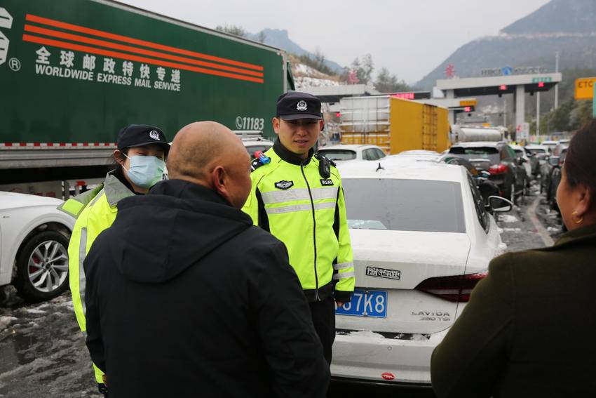 花林寺派出所民警在所长安辉的带领下,在高速出入口疏导、指挥交通20小时,协助高速公路工作人员和当地村民免费为滞留人员送水送食,化解滞留人员情绪,组织夜间暖心巡护,确保了滞留人员安心、平安过夜。