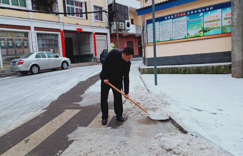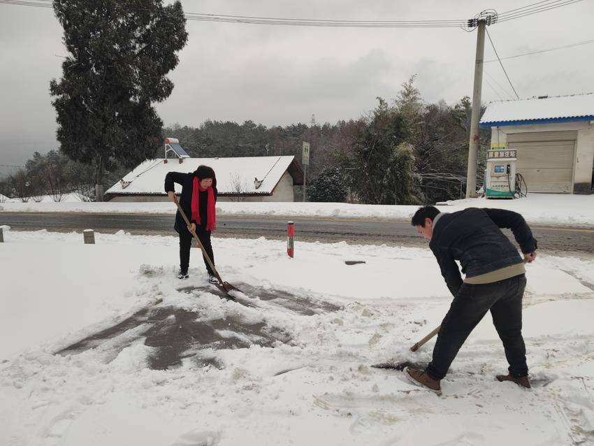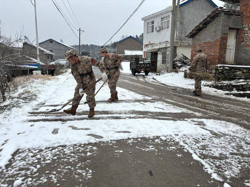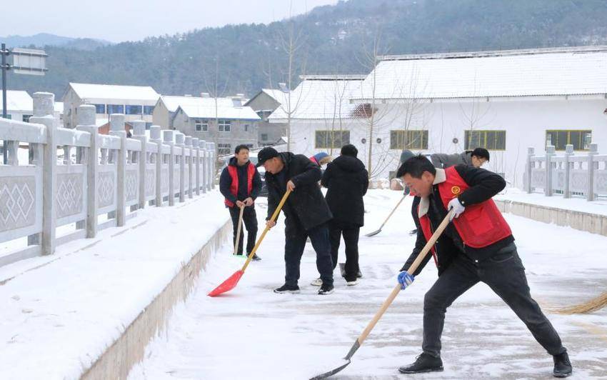 嫘祖镇分水村“兵支书”徐文豪带领村干部开展道路扫雪活动,查看积雪厚度,检查辖区内群众生活状况,提醒村民注意出行安全及用火、用电、用气安全。