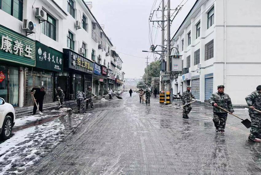鸣凤镇103名退役军人突击队员闻雪而动,他们身着军装,手持铁锹,在南门路步行街、车站、商超等人流量较大路段参与清雪除冰行动,保障春运返程道路通畅。