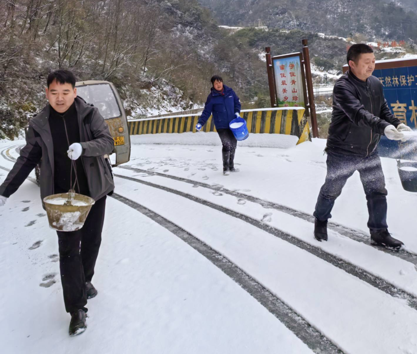 河口乡退役军人不畏严寒、身先士卒,手持铁锹扫帚,奔赴省道、集镇主干道、通村主干道、易结冰桥面铲雪扫雪,撒盐除雪,有的铲、有的推、有的扫。针对易凝冻结冰路段及时摆放警示牌,发送温馨提示,提醒过往群众、车辆谨慎通行。