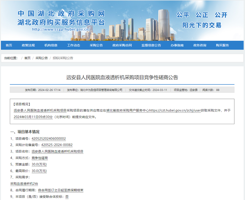 湖北日报客户端讯(通讯员 李弘扬)2月27日,湖北省远安县迎来了政府采购领域的重大突破—远安县人民医院血液透析机采购项目完成竞争性磋商公告发布,标志着远安县首个通过湖北省数据汇聚平台发布到省政府采购网的项目正式启动。这一项目的启动不仅代表了远安县在政府采购领域的进步与突破,也为全省政府采购“一张网”工作奠定了坚实基础。
