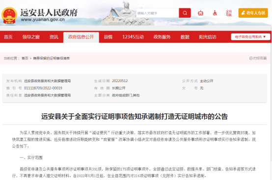 一是稳步推进“减证便民”,清理“零遗漏”。全面深化证明事项告知承诺制,打造“无证明城市”,对《远安县县级依申请及公共服务事项清单》中的1390项行政服务事项,逐项开展证明事项清理。经清理,县本级216项证明事项均实现通过法定证照、数据共享、部门核查、告知承诺等方式办理,并通过县政府门户网站部门端口及政务公开栏,将清理结果向社会进行公示。