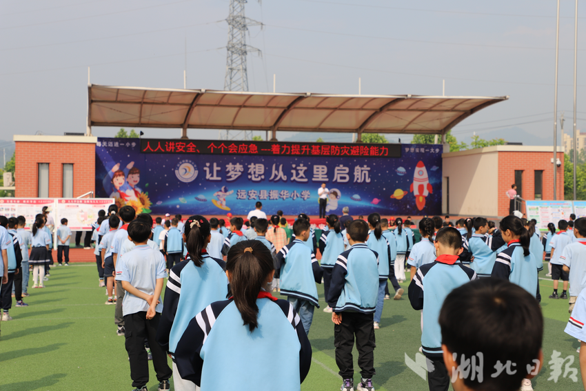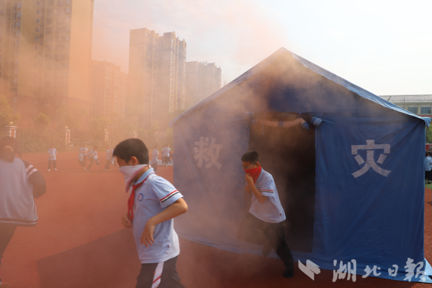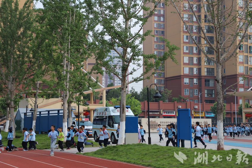 活动以地震来临为演练背景,随着校园报警铃声响起,教师引导同学们有序撤离到操场紧急避险。
