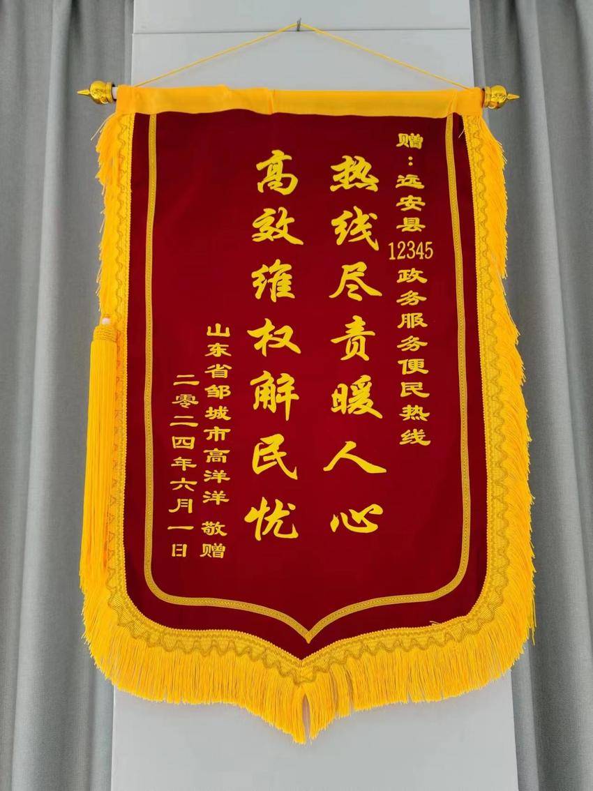 湖北日报客户端讯(通讯员郑莹莹)6月7日,远安县12345政务服务便民热线话务中心收到山东省邹城市高先生寄来的两面锦旗,一面“热心尽责暖人心 高效维权解民忧”赠与远安县大数据中心12345热线团队,一面“公正执法 热线为民”赠与远安县嫘祖派出所,表达了对热线及派出所暖心服务、高效维权的高度赞扬和感激之情。