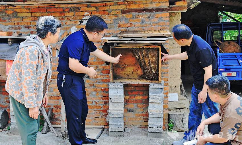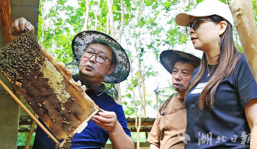 在距离“张村长”拍摄点不远处的甜蜜谷养蜂基地,青年赵家路正在蜂场里查看巢脾状态,这也是他开展养蜂全过程管理的重要环节。