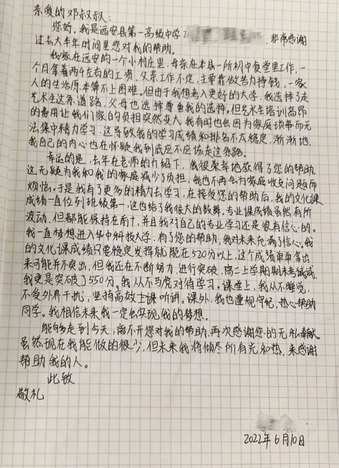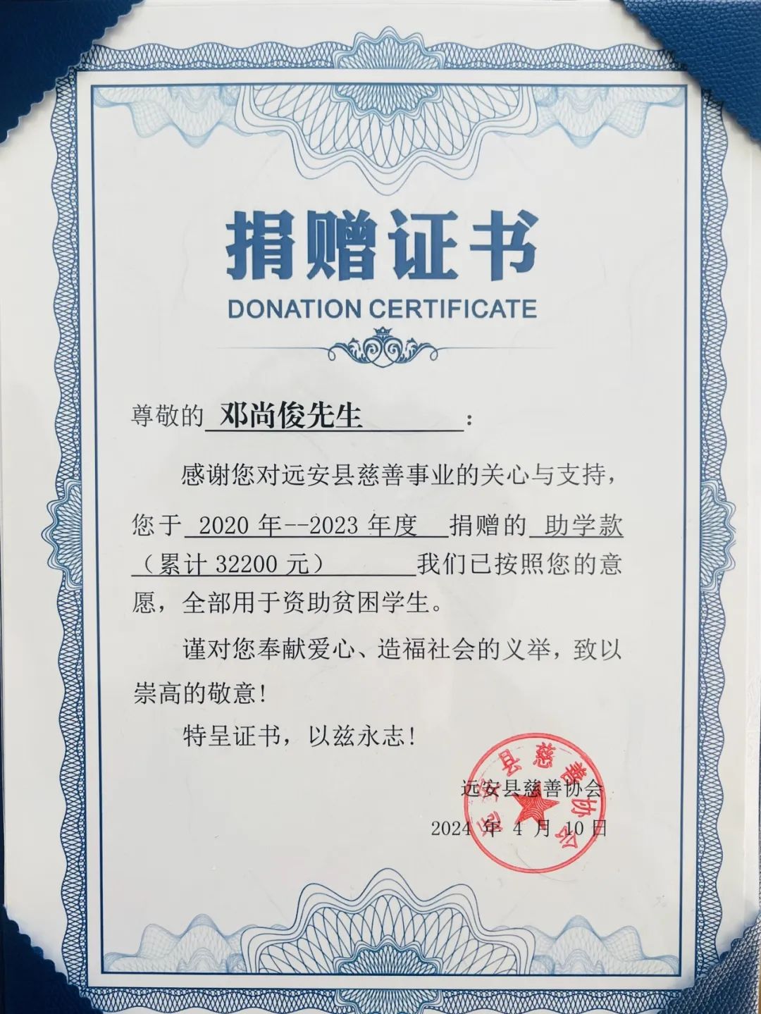 在2020年11月,邓尚俊与远安县慈善协会建立联系,并表达了他的愿望:利用自己有限的资源帮助家乡经济困难的学子们完成学业,顺利进入大学深造,培养他们成为对社会有贡献的人才,并鼓励他们未来回报社会。 县慈善协会与远安县第一高级中学取得联系之后,邓尚俊在4年间持续资助了9名处于困境的高中生,累计捐款数额超过3万人民币。这些学生均成功进入大学学*,其中一位更是被西南财经大学录取。为确保他们能顺利完成学业,这些大学生将继续受到邓尚俊的资助,直至大学毕业。