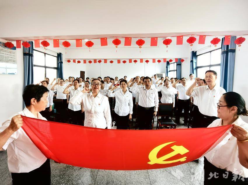 “我志愿加入中国***,拥护党的纲领,遵守党的章程,履行党员义务,执行党的决定…”在老年大学501教室,全体党员面向鲜红党旗重温入党誓词,坚定理想信念,牢记初心使命。