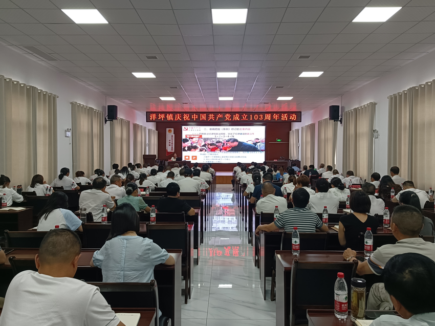 下午,洋坪镇组织全体机关干部、各支部书记、纪检委员、财经委员、新发展的党员等共计160余人,召开庆祝中国***成立103周年大会。县党委科研股股长易平以《以严明局纪律 推进全面从严治党向纵深发展》为题开展专题授课。会上集中观看全县“支书达理”微党课展播视频,两名退休党员代表田圣智及文宗林进行主题发言,新党员集中宣誓。洋坪镇党委组织委员、统战委员王磊带领参会人员集中学*酒驾醉驾典型案例,警示广大党员干部以案为鉴,以案明纪,以案促改。