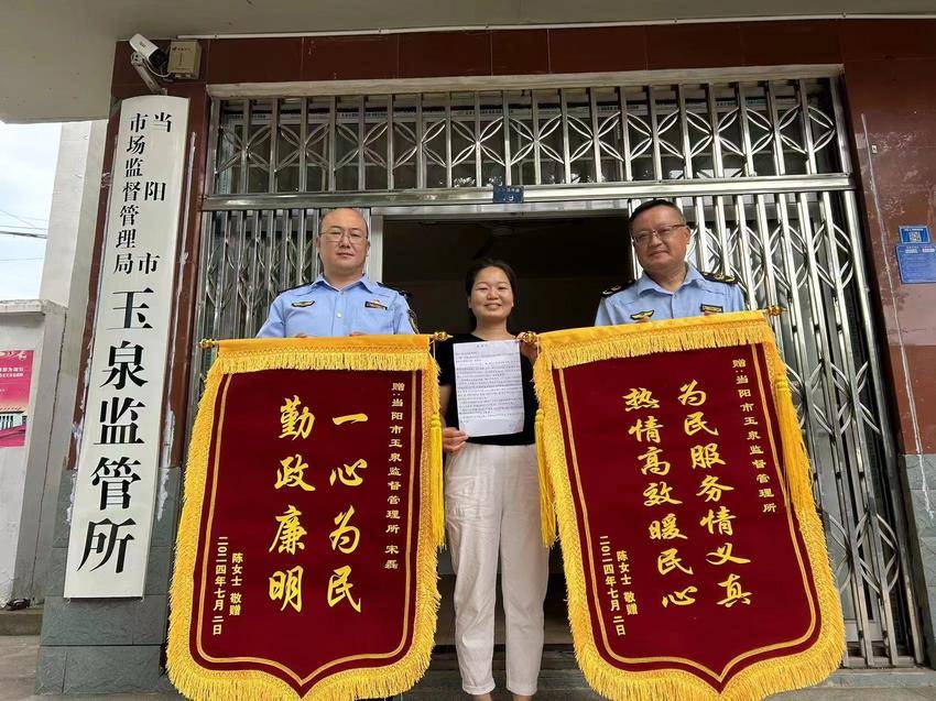 湖北日报客户端讯(通讯员 夏凯)7月3日上午,消费者朱女士为当阳市市场监督管理局玉泉市场监管所送来锦旗和感谢信。