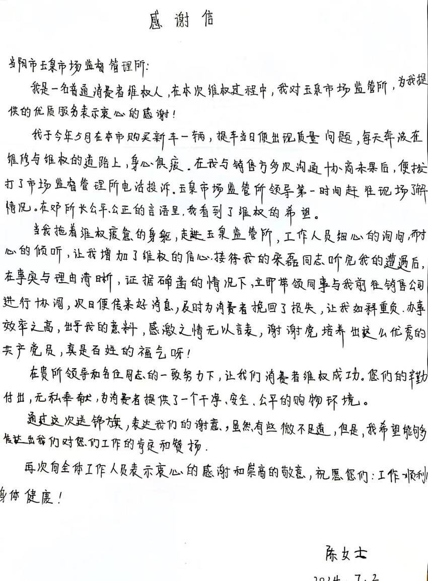 信中写道:“办事效率之高,出乎我的意料,感激之情无以言表,谢谢党培养出这么优秀的***员,真是百姓的福气呀!”“在贵所领导和各位同志的一致努力下,让我们消费者维权成功。你们的辛勤付出,无私奉献,为消费者提供了一个干净、安全、公平的购物环境。”字里行间,流露出对市场监管部门工作人员热情高效服务、为民排忧办实事的感激和认可。 据悉,5月7日,朱女士在某公司购买了一辆五菱荣光新卡汽车,花费人民币59800元。提车当日仅行驶20km后,车辆便间歇性出现抖动、发动机故障灯亮起、无法提速等故障。至6月4日,该车在三包有效期内因同一质量问题累计修理6次,朱女士要求退换车辆,遭该公司拒绝,遂于6月5日拨打12315投诉热线,请求市场监管部门介入调解。当阳市市场监管局在接诉后,执法人员多次上门组织矛盾双方开展调解,并对该销售公司下达《履行保护消费者权益义务告知书》,告知该公司按照《中华人民共和国消费者权益保护法》相关规定依法履行经营者相关义务,拒不履行法定义务涉嫌违法,将被依法立案查处。在依法用情调解下,双方最终达成一致和解意见,目前该公司已向消费者退还全部的购车款、保险费用、税费等合计70042.81元,本次消费纠纷得以圆满解决。 当阳市市场监管局坚持服务民生、服务高质量发展理念,着力构建多维度、广联动、全方位的消费保障体系,推进消费纠纷源头化解、消费维权社会共治、举报核查靶向执法,全力维护消费秩序、激发消费活力、优化消费环境,真正让老百姓便捷维权、放心消费,实实在在地体验消费领域的获得感、幸福感和安全感。 |