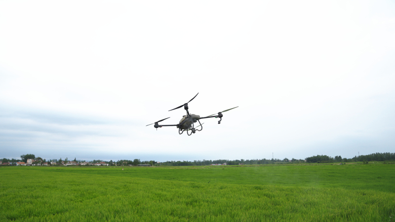 在当阳市庙前镇清平河村千亩水稻种植基地,植保无人机正在沿着稻田匀速飞行,有序地向田间喷扫药剂,短短几分钟,就完成了几亩地的飞防作业。