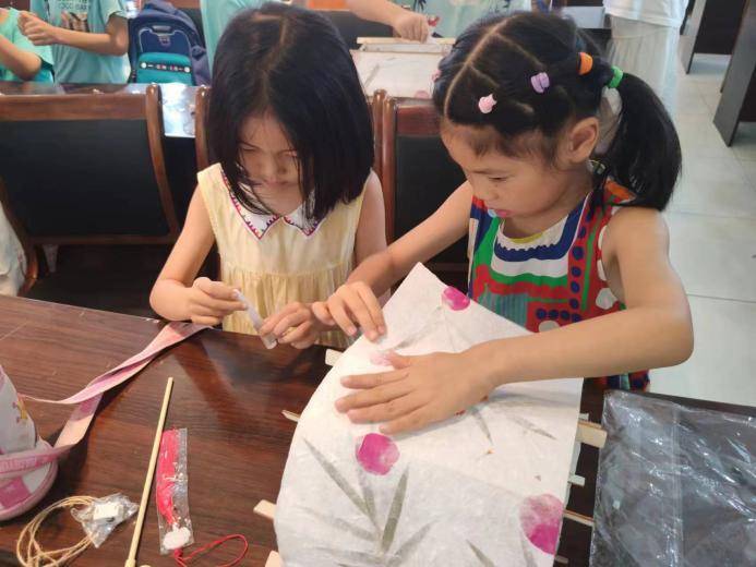随着讲解的深入,活动进入了最为精彩的环节——手工制作灯笼。桌上,早已备好了各式各样的材料:色彩淡雅的布片、柔软的丝线、削好的竹条……在老师的悉心指导下,孩子们的小手开始忙碌起来。