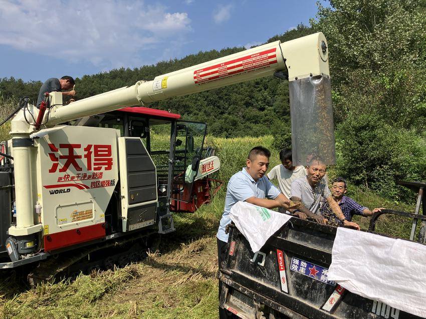 湖北日报客户端讯(通讯员袁军、杨丹)初秋稻田遍地香,农机收割丰收忙。一辆崭新的联合收割机正在稻浪中欢快地来回穿梭,稻谷尽数倒下,切割、脱粒、粉碎秸秆一气呵成。驻村工作队队员、村干部在一旁帮忙,人员机械齐上阵,秋粮颗粒皆归仓,好一派丰收景象。