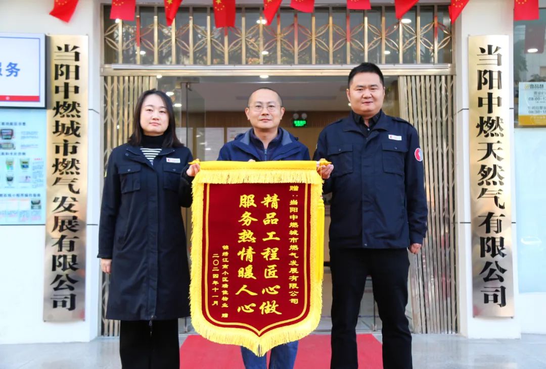 12月3日,当阳市锦绣江南小区物业为当阳中燃城市燃气发展有限公司赠送“精品工程匠心做,服务热情暖人心”的锦旗,表达对当阳中燃在小区燃气改造工作中周到服务、尽职尽责,高质量完成燃气设施设备改造的赞许和谢意!