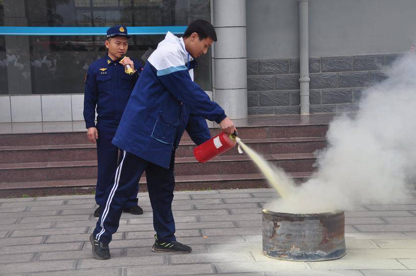 讲座结束后,进入实操演练环节。在学校操场,消防人员现场展示并讲解了灭火器、消火栓等常见消防器材的使用方法和操作步骤。“一提、二拔、三握、四压,对准火焰根部喷射……”消防人员一边大声讲解,一边进行示范操作。随后,邀请部分师生亲自上场体验。同学们热情高涨,纷纷踊跃参与。在消防人员的耐心指导下,同学们成功扑灭模拟火源,切实掌握了灭火器的使用技巧。对于消火栓的操作,消防人员也进行了细致教学,从水带的展开、水枪的连接到喷水灭火,让师生们有了更直观的认识。