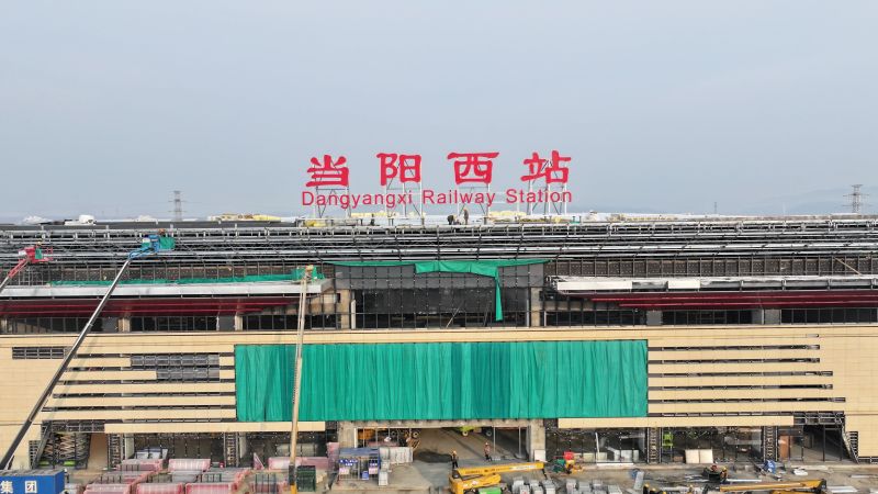 除了安装站名牌,当阳西站的内外装修工程也在如火如荼推进,一、二号站台地面石材正在铺贴,站台标牌陆续安装中。站房内部正在铺贴地面石材,安装室内吊顶、站房幕墙龙骨、玻璃幕墙等。