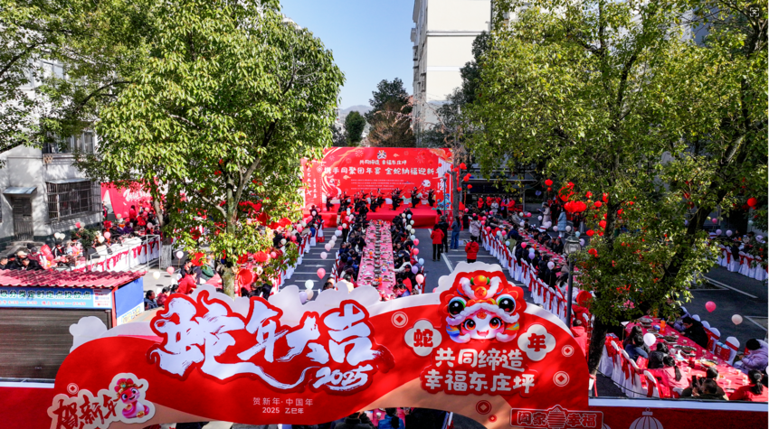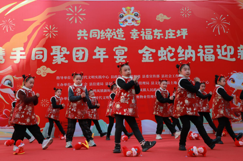 湖北日报客户端讯(通讯员陈君、洪伊宁、王昕)1月15日,远安县鸣凤镇东庄坪社区联合宜昌市佳奥物业管理有限公司,在三吉花园片区共同举办“携手同聚团年宴 金蛇纳福迎新年”迎新春系列活动,420余名居民到场参加,现场活动精彩纷呈,群众欢聚喜迎新春。
