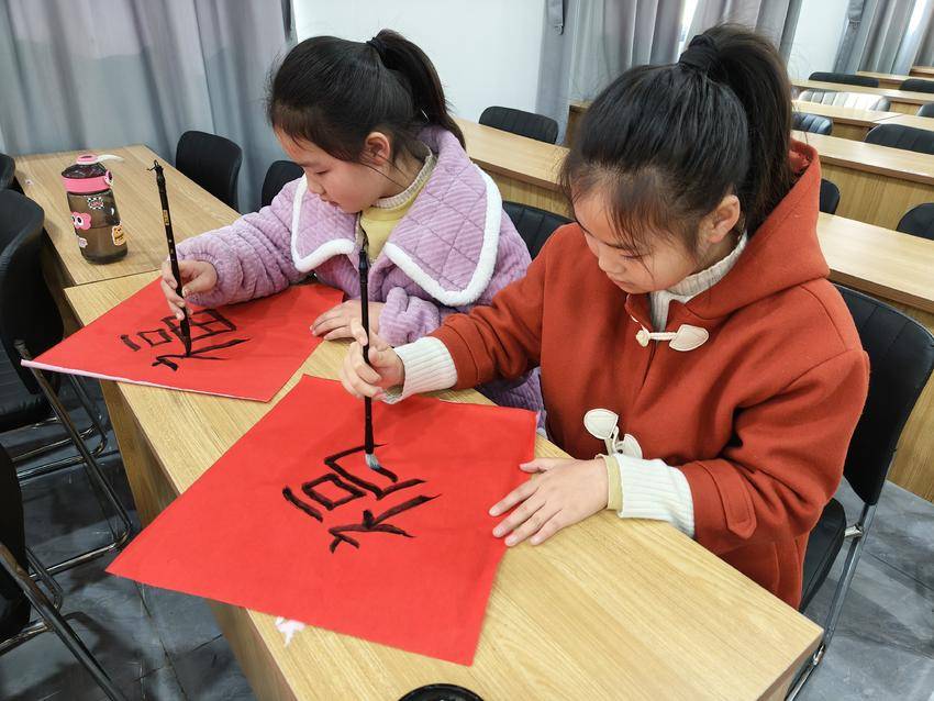 为了让孩子们更深刻地感受春节的文化底蕴,志愿者还带领大家赏析了多首春节经典诗词,让孩子们在诗词的韵律中,领略到古人对春节的深厚情感。同时,现场分发红纸书写寓意吉祥的福字,孩子们挥毫泼墨,把祝福融入笔端,一个个饱含神韵的“福”字在行云流水间新鲜出炉。红红的福字、淡淡的墨香,增添浓浓的“年味儿”。