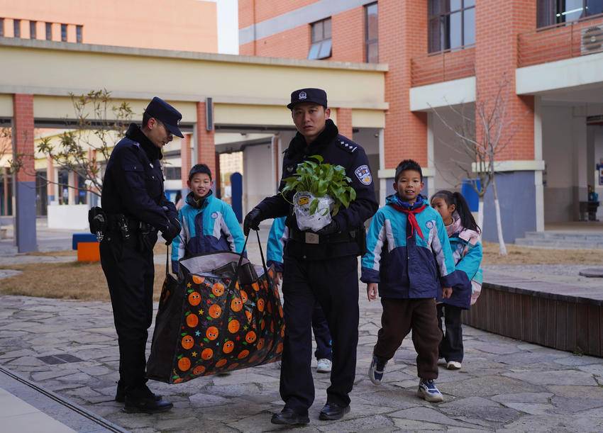 湖北日报客户端讯(通讯员李开明、郑黎姣)“小朋友莫慌,叔叔帮你搬行李”2月13日,远安县33所中小学和幼儿园如期开学,远安公安全面启动春季护校模式, 86名民辅警深入校园疏导交通,维护秩序,帮助搬运学生行李,落实全天候“护校安园”工作措施,为全县1.9万名师生春季开学提供安全保障。
