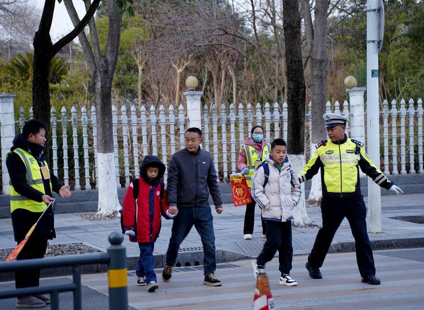 “民警把我的孩子牵过马路,送进校门,让我们家长感到安全和温馨”2月13日上门,鸣凤城区的张阿姨驾驶私家车送孩子到鸣凤中心小学入学,自己还没有下车,孩子就被在此护学的交警送进了学校。