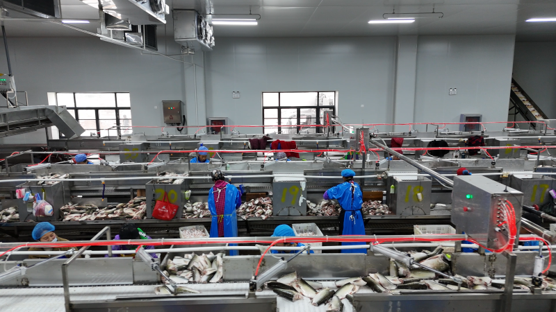 在福美园的淡水鱼生产加工车间,车间内智能化设备正全速运转,工人们与自动化流水线紧密配合,经过宰杀、开背、冲洗等数个加工环节,一条条鱼很快被分割成鱼片、鱼排、鱼块、鱼糜等多个部分包装出售。