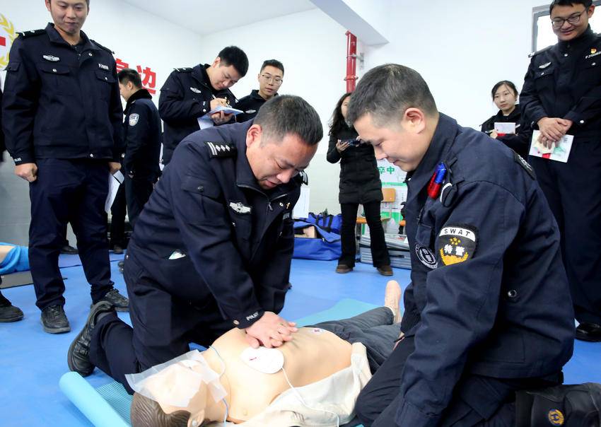 民警聆听救护师授课 在培训现场,四名救护师资通过“理论讲解+实操演示”的方法,详细介绍了心肺复苏、AED的使用、气道异物梗阻处置方法、创伤包扎等急救知识,参训民警在救护师一对一的悉心指导下,反复模拟急救场景,严格规范地进行每一步操作练*,力求动作精准熟练,确保在紧急关头能迅速响应、高效施救,充分利用“黄金四分钟”挽救生命,切实履行保护群众生命安全的职责。