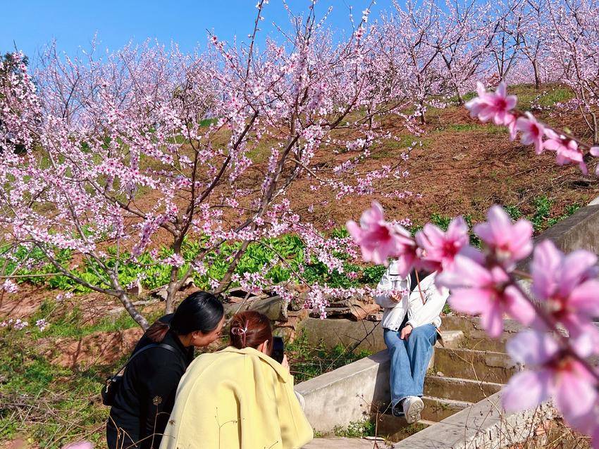 居民王女士拿着手机,为朋友定格此刻美景,她笑着分享:“这里的桃花开得特别早,桃树低矮,规模又大,拍照特别出片,所以今天特意约了朋友来打卡。而且除了桃花,还能看到油菜花和李子花,一站式赏遍春日繁花,真的太惬意了。”