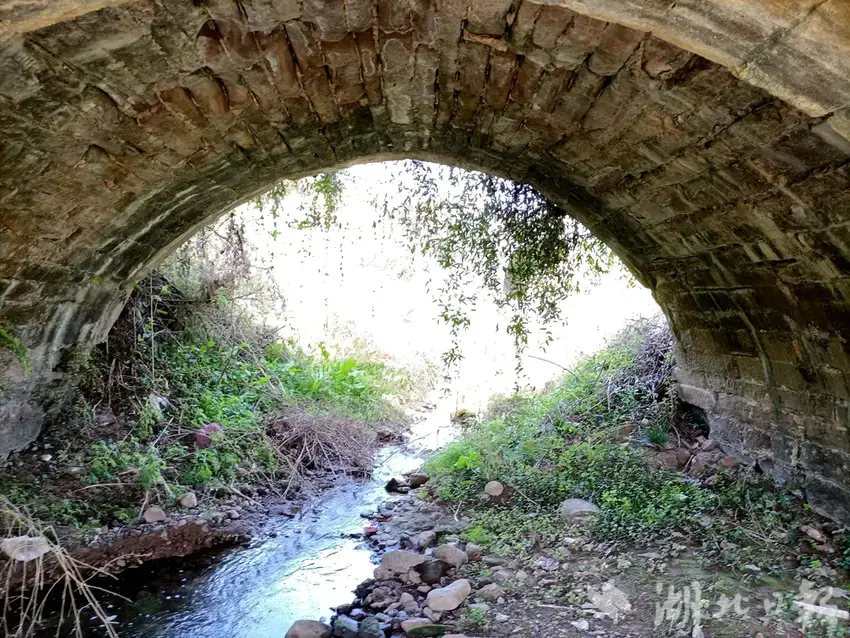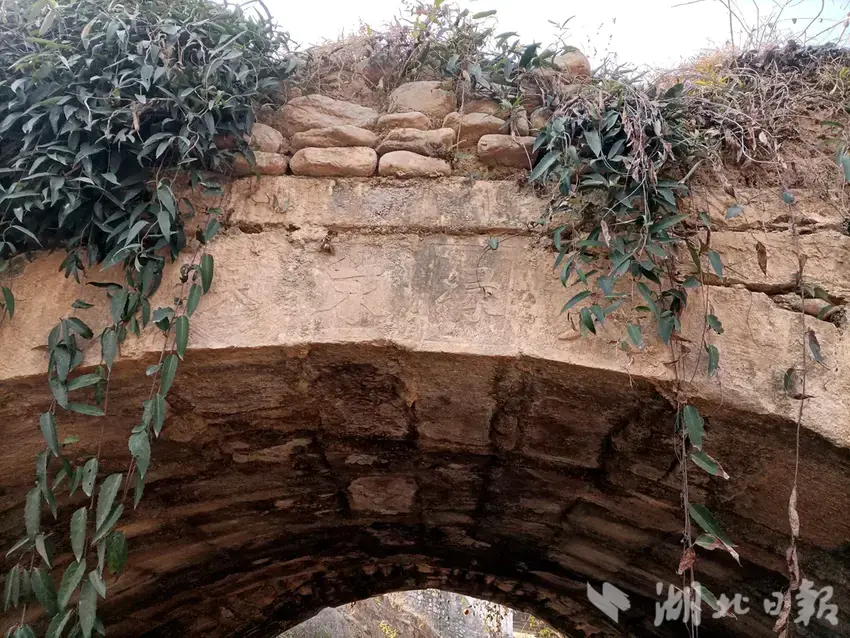 2019年国庆节期间,作家谭岩从武汉回远安,说准备写《远安传》,我和古文功底深厚的覃桂泉老师一起陪同谭岩老师开展田野调查。虽然快寒露节了,艳阳高照,天气还是热,我们来到和氏桥。走近石拱桥,桥面长一棵火锅样粗细的香椿树,杂草横生,担心深草里面窜出一条蛇来。弄个棍子拨开荆棘杂草,一阵鼓捣,来到桥下。 只见青藤如帘垂于红砂石拱,要不是谭老师来过,怎么也想不到这大椿天树下会有一座石拱桥。抬眼望,拱门朝向沮河面顶上的四块石头上有四个字。桥石潮湿,加上青藤和青苔遮掩,只能确认右边第一个字是“天”。进了拱桥的河底,凉意幽幽,规正的红砂条石在岁月和洪水的冲刷下,显得斑驳陆离,古朴苍凉。移步细看,发现这不是一座桥,是不同时期修建,靠在一起的两座桥,上游桥高于下游桥约一尺。 从石质风化的程度看,上游桥要早于下游桥。同行的谭老师说,别小看这荒郊野外的老石桥,多部史书都有记载。猜想卞和献玉,一定是从玉印岩而来,跨过这石桥去见楚王的。同行的覃老师说:“长城,桥上四个字,你认出一个‘天’字,我看第二个字是‘绿’。天禄是一种神兽,这里的绿可能和禄是通假字。”