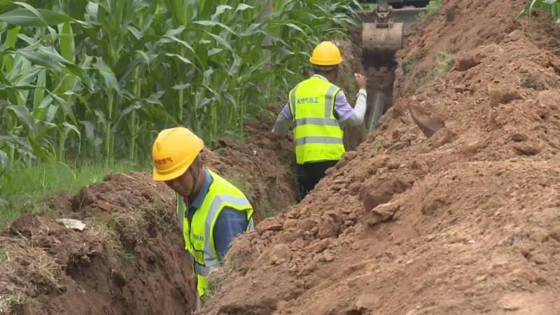 在当阳市淯溪镇联合村的燃气管道施工现场,工人们正忙着敷设填埋燃气管道。据介绍,目前淯溪镇天然气工程燃气管道和气源设施建设正稳步推进,计划于6月中旬前完成联合村庭院管道及燃气入户工程,在今年可实现全镇通气。