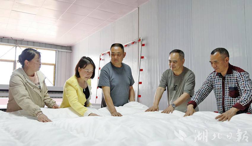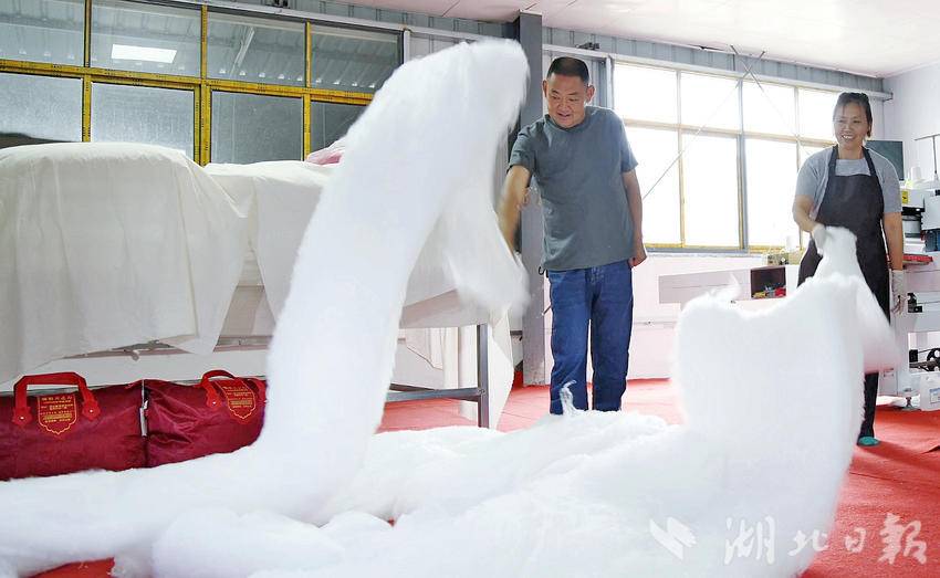 在蚕丝被生产车间,陈启俊和妻子像“舞龙”一样拉丝后,将轻盈丝滑的蚕丝平铺到设备上加工。他坦言:“全部是用蚕茧加工成的真蚕丝,客户口碑很好,基本不愁销路。目前合作社年可生产优质蚕丝被2000余床,产值300多万元!”