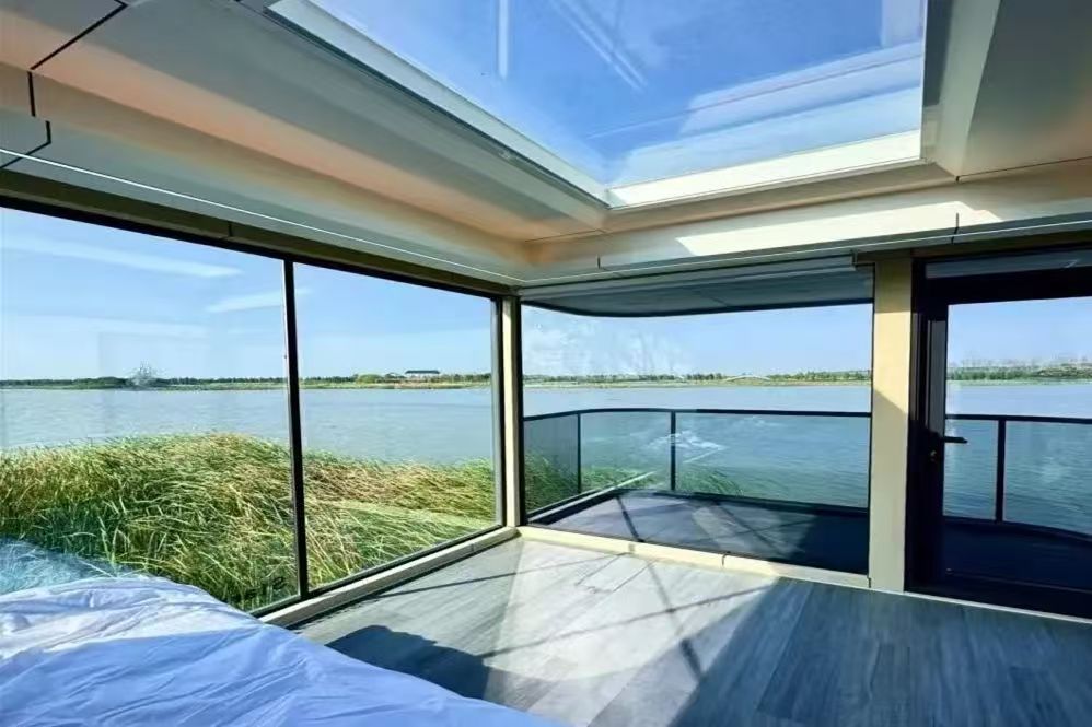 全景落地窗将四季画卷引入室内:初夏赏“小荷才露尖尖角”,盛夏观“接天莲叶映日荷花”;秋日品“落霞与孤鹜齐飞”,冬季邂逅优雅的“西伯利亚来客”天鹅。最绝的是智能天窗系统——躺在床上,浩瀚银河仿佛触手可及,真正实现“枕星河入梦,闻鸟语醒来”的奇幻体验。