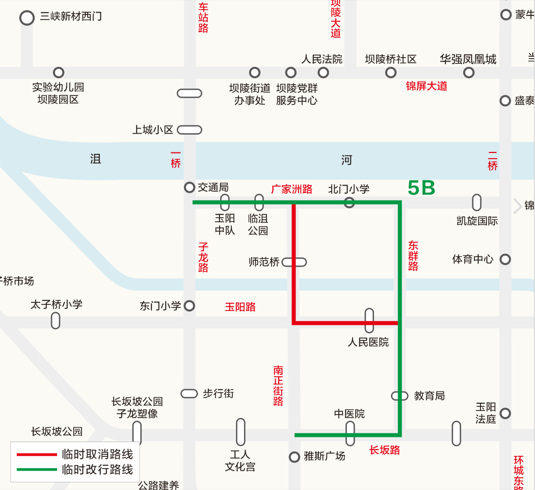 5B路:临时取消中央锦城、师范桥、一中等停靠。改行临沮公园、凯旋名邸、教育局、中医院,双向一致。