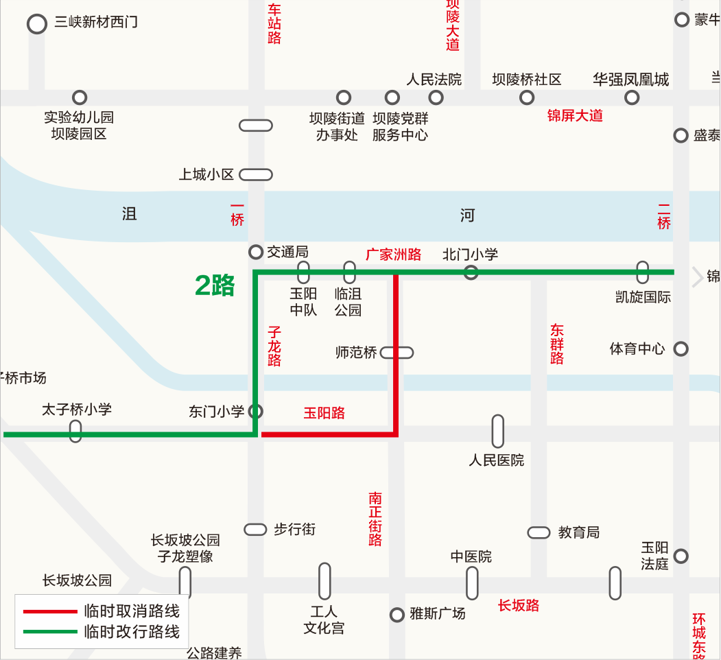 2路:临时取消长坂坡购物广场、师范桥、中央锦城等停靠。改行中央街区、玉阳中队、北门小学、北门公寓,双向一致。